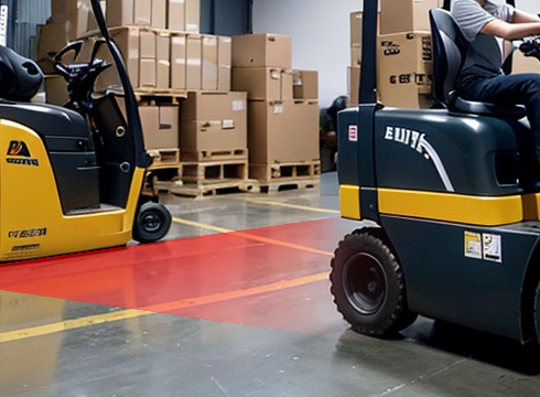 为叉车划定作业区,检测车辆的左、右、后三路方向,当有工作人员或货物接触到红光,灯光快速闪烁,同时喇叭发出警报,系统还会自动进行限速刹车,提醒工作人员远离危险源。